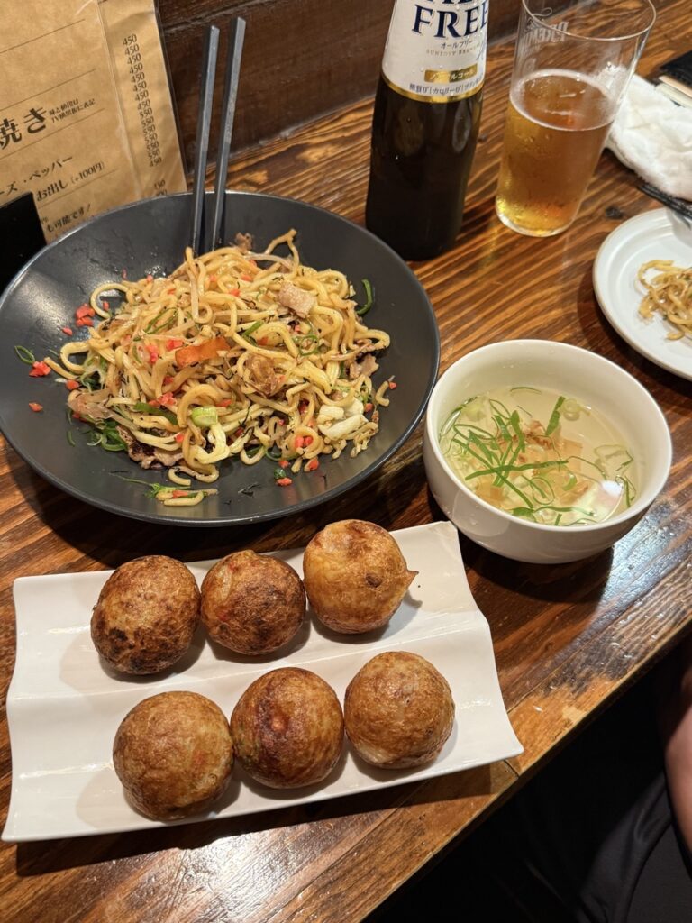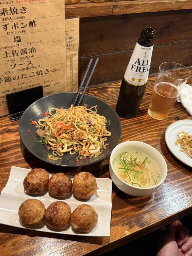 나는 논알콜 맥주, 타코야키 6개 (650엔), 그리고 야끼소바 (800엔 수준) 주문.